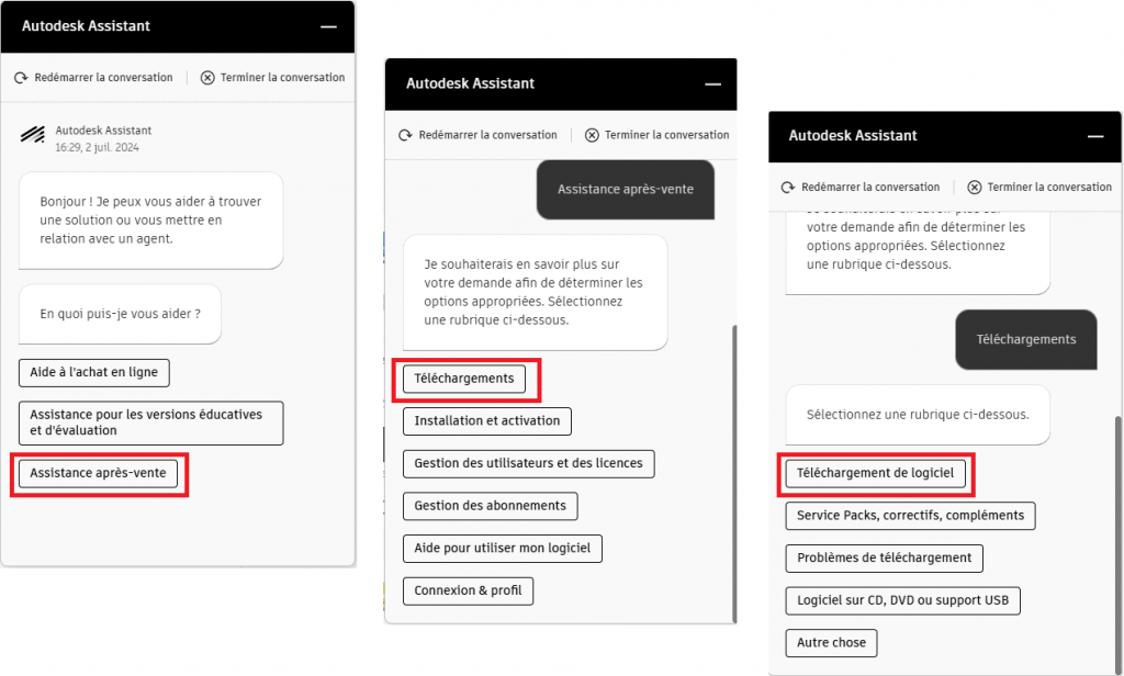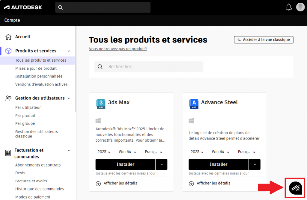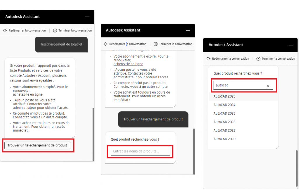 Vous pouvez accéder à la dernière version de votre produit et jusqu’à trois versions dans le compte Autodesk. Cette vidéo vous montre comment . Pour accéder à jusqu’à 5 versions précédentes (dans la plupart des cas), contactez le Autodesk Virtual Agent (AVA). Après ava fournit votre téléchargement, vous pouvez contacter si vous avez besoin Autodesk support d’un code d’activation.