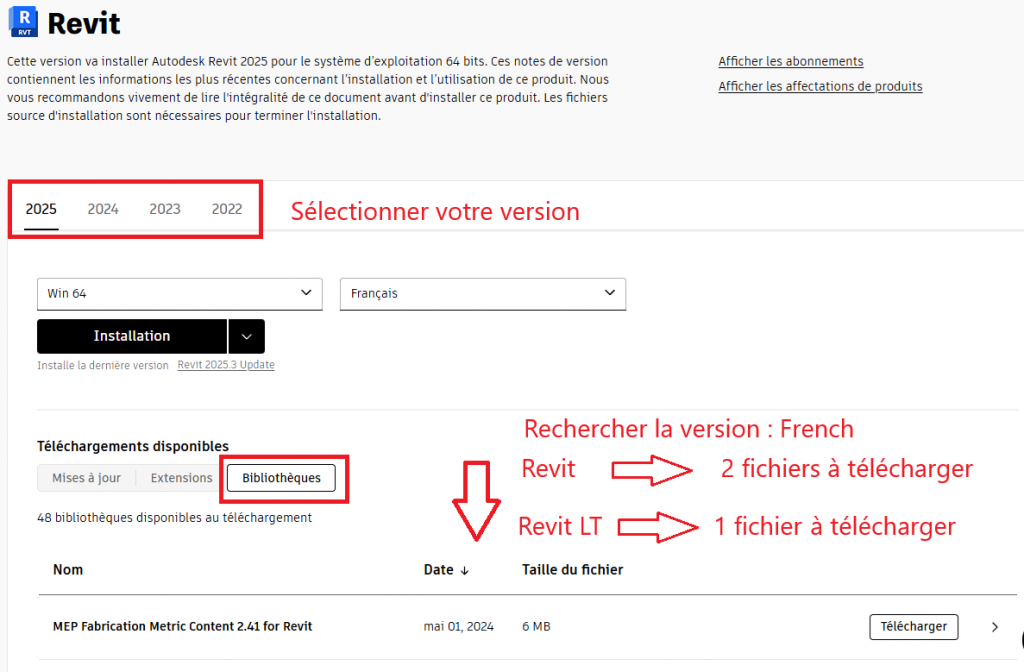 Sous Tous les produits et services, recherchez Revit. - Téléchargements disponibles => Bibliothèque